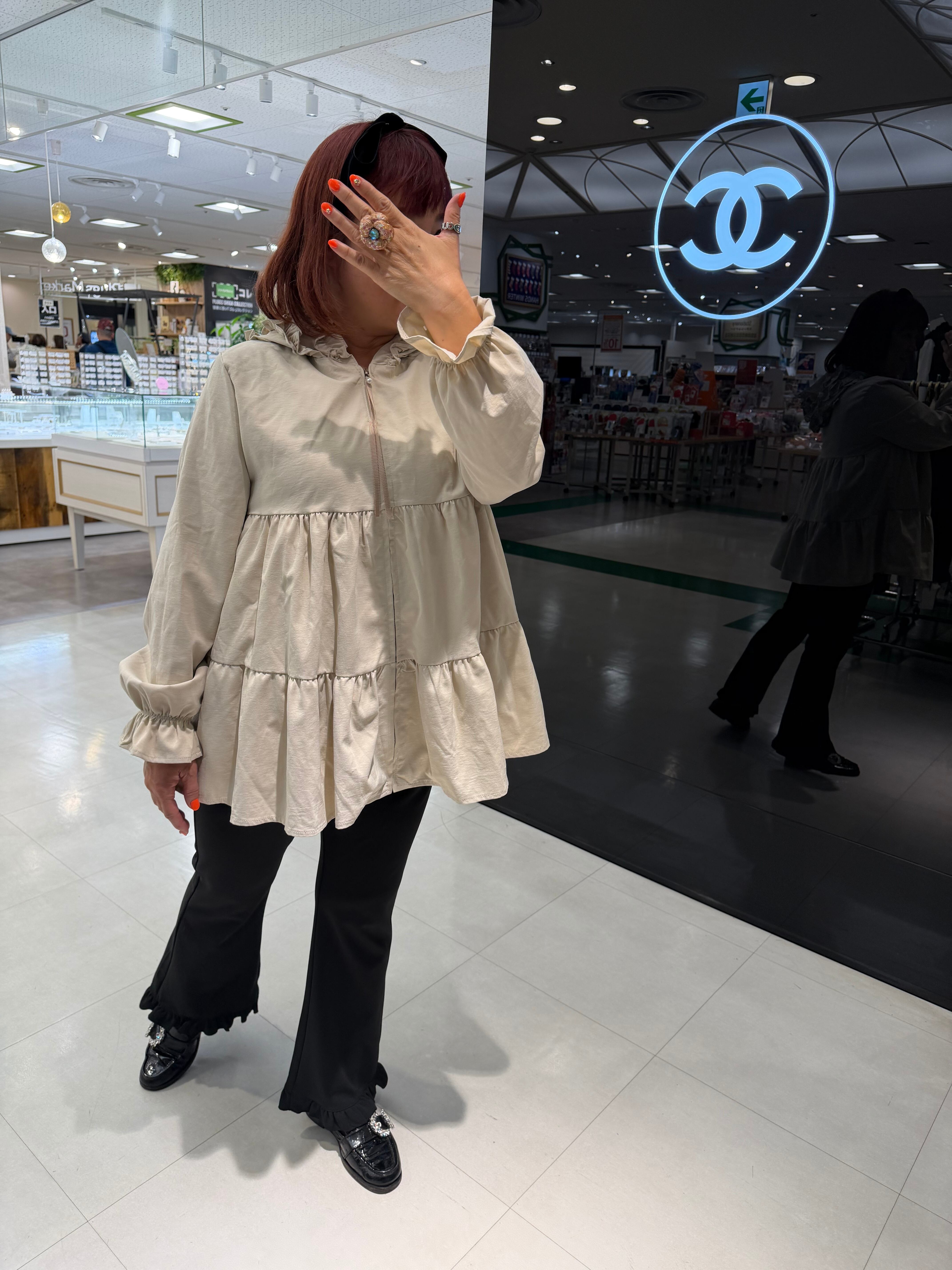 フードにあしらったラッフルフリルが華やかに魅せる一枚。